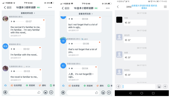 此外,大家在线上教学的过程中不断反思,不断创新总结线上教学的最优模式。老师们经过讨论普遍认为员工课下练习口语的主动性较低,而且课上练习听力容易一刀切,英语基础不同的同学都要按照老师设定的同样的步骤和时间进行练习。基于此,老师们认为线上听说课应该是课上说为主,课下听为主,课下重输入,课上重输出。教师们运用任务驱动教学法,课下员工利用超星学习平台完成听力任务;课上利用钉订直播,老师集中讲解课下听力任务中的重点和难点,要求员工以口语形式输出要求的内容。这样,平时传统课堂上比较内向不善于表达的同学也能在线上积极参与口语练习,极大的增加了员工们的自信心和成就感。