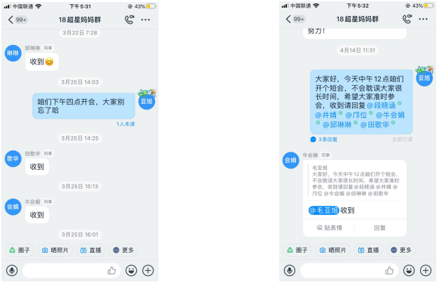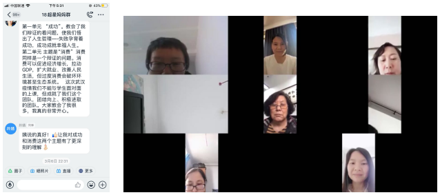 课堂教学之余,每周课后团队老师们都会通过钉钉视频会议交流课上的教学情况,讨论教学中的成功经验和问题。大家各抒己见,畅所欲言,老师们普遍反映每周的钉钉会议能够促进自身的教学反思以及教学改革,较好地提高自身的教学能力。