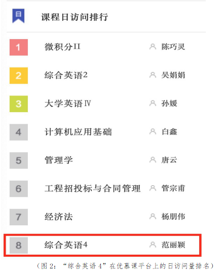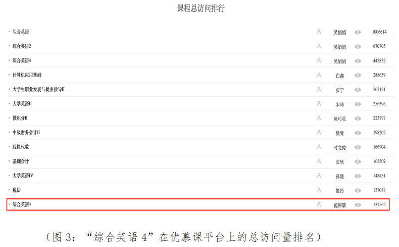 从传统的面授课堂到线上教学,小组内各位教师团结一心,共克时艰。在团队共同努力下,“综合英语4”优慕课平台学习人次稳定排名靠前。在公司教务处优慕课平台统计的课程日访问量中,全校排名第8位,并且在课程总访问量的统计中,全校排名第13位,达到131562人次。
