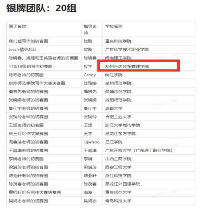 2月18日-4月21日,组织员工参加了由全国高等学校大学外语教学研究会指导,全国高校大学外语教育数字化联盟和中国高校英语写作教学联盟联合主办的首届“钉钉杯”全国大学外语写作大赛,本次大赛全程通过钉钉平台在线上进行。来自全国3000多所高校的近30万名参赛选手参加比赛。最终, 权宇、张庆凯、葛静懿、吴乔艳和王新平老师带队的“17&19级钉钉全国写作团队”在3000多个团队中排名全国前14名,荣获国家级“银牌团队”奖,34名员工在个人决赛中荣获国家级“优秀作品”奖。