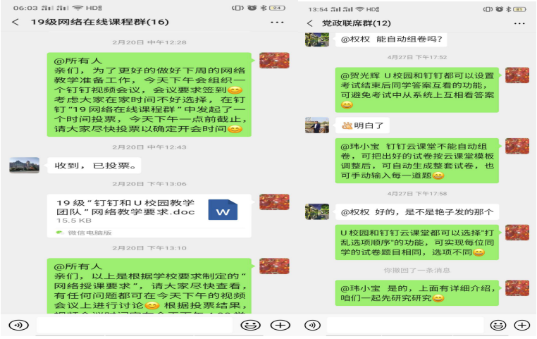 充分利用钉钉云课堂、U校园和优慕课三大资源平台,通过钉钉的班级群、教学圈子以及员工小组等三大形式来开展教学实践。