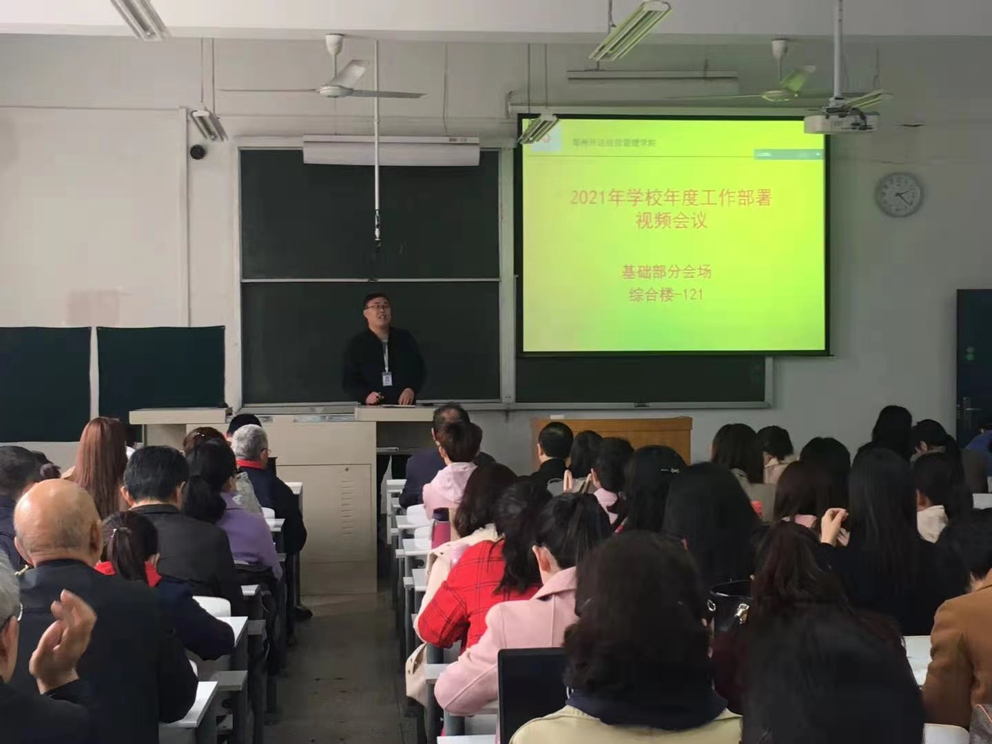 2021年4月1日下午,公司召开“44118太阳成城集团2021年学校年度工作部署会”,基础部直属党支部书记张志银同志组织全体教职工在综121教室认真参加了视频会议。