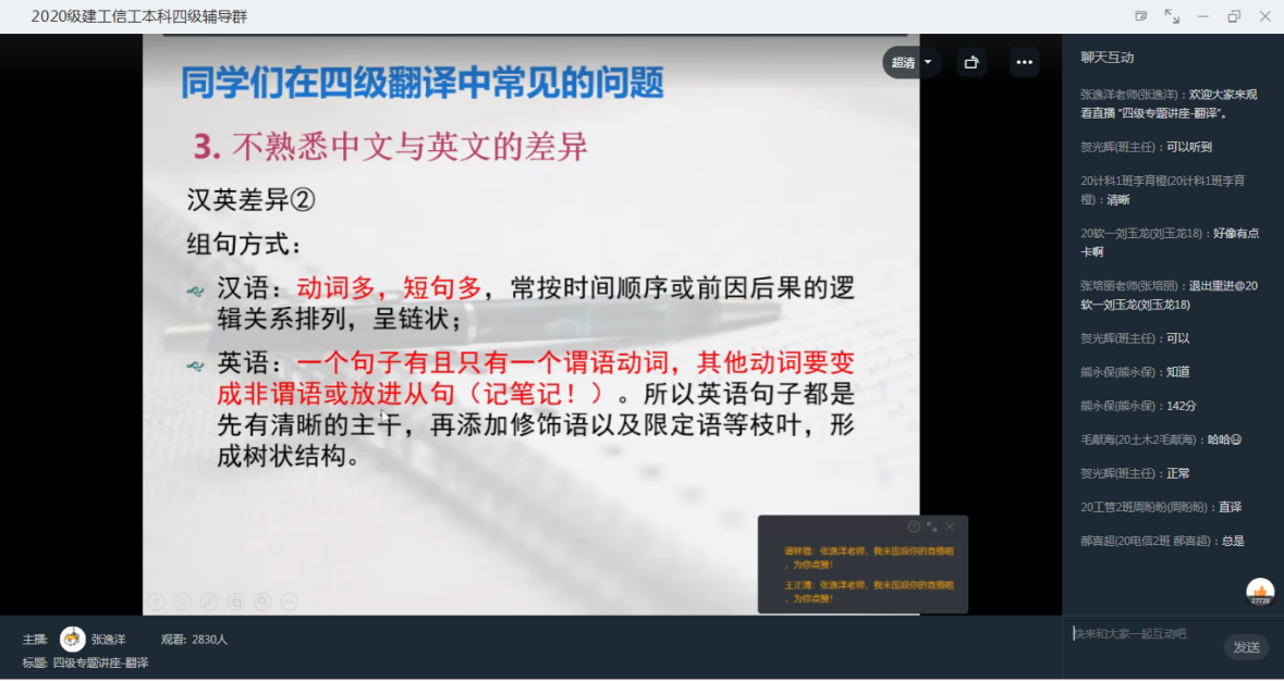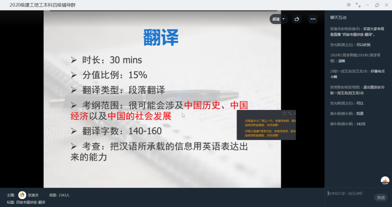 大学英语四级考试是衡量老员工英语水平的重要方式,四级考试的通过率也能从侧面反应学校英语教学的质量,而翻译往往是老员工在四级考试中容易失分的环节。为了提升2020级员工的英语翻译能力,在基础部主任王莉莉教授的指导和第二教研室教师的精心组织下,基础部大学英语四级备考线上辅导系列三--翻译辅导讲座在9月2日晚7:30如期举行。本次讲座由第二教研室张逸洋老师主讲。