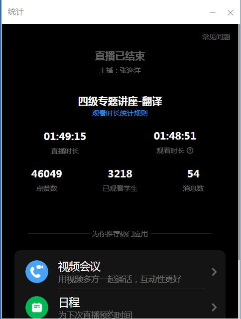 本次讲座共有三千余人观看,累计点赞数达到四万多次。在直播过程中同学们讨论热烈,响应积极,参与感十足。这次讲座不仅充分调动了员工的积极性,而且为广大学子提供了翻译的做题思路,在师生间获得一致好评。基础部将从这几次讲座中汲取经验,继续为同学们提供优质的四级辅导内容,使公司四级通过率再上新台阶。