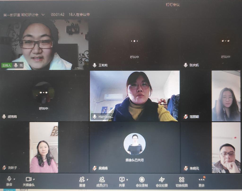 近日,基础部第一教研室在线召开了期初教学研讨会议。研讨会围绕如何有效地进行开学第一课、如何在日常教学中融入四级辅导、如何开展课堂互动活动等问题展开了热烈讨论,大家互通有无,研讨成效显著。会议由教研室主任权宇副教授主持,基础部主任王莉莉教授和全体教研室教师参与了研讨会。