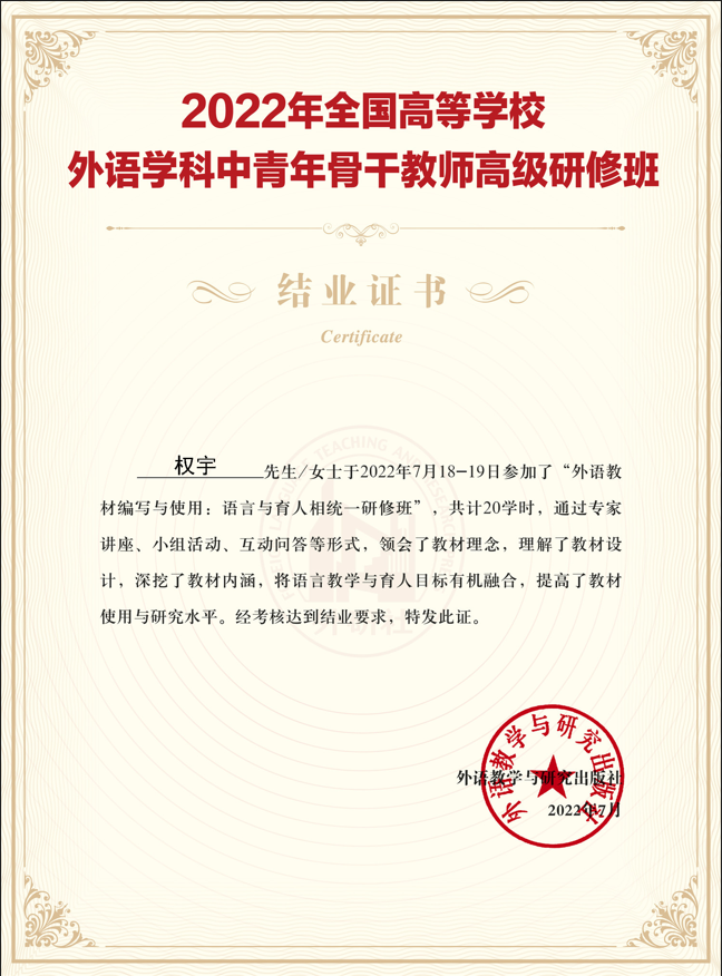 2022年7月18-19日,基础部选派大学英语第一教研室主任权宇副教授参加了2022年暑期全国高等学校外语学科中青年骨干教师外语研修班,研修班在线举行。权宇老师全程参与了专家讲座,分组研讨以及小组汇报等研修内容,与来自全国300余所院校的近400名教师共同探讨,通过教研结合促进自身专业发展。