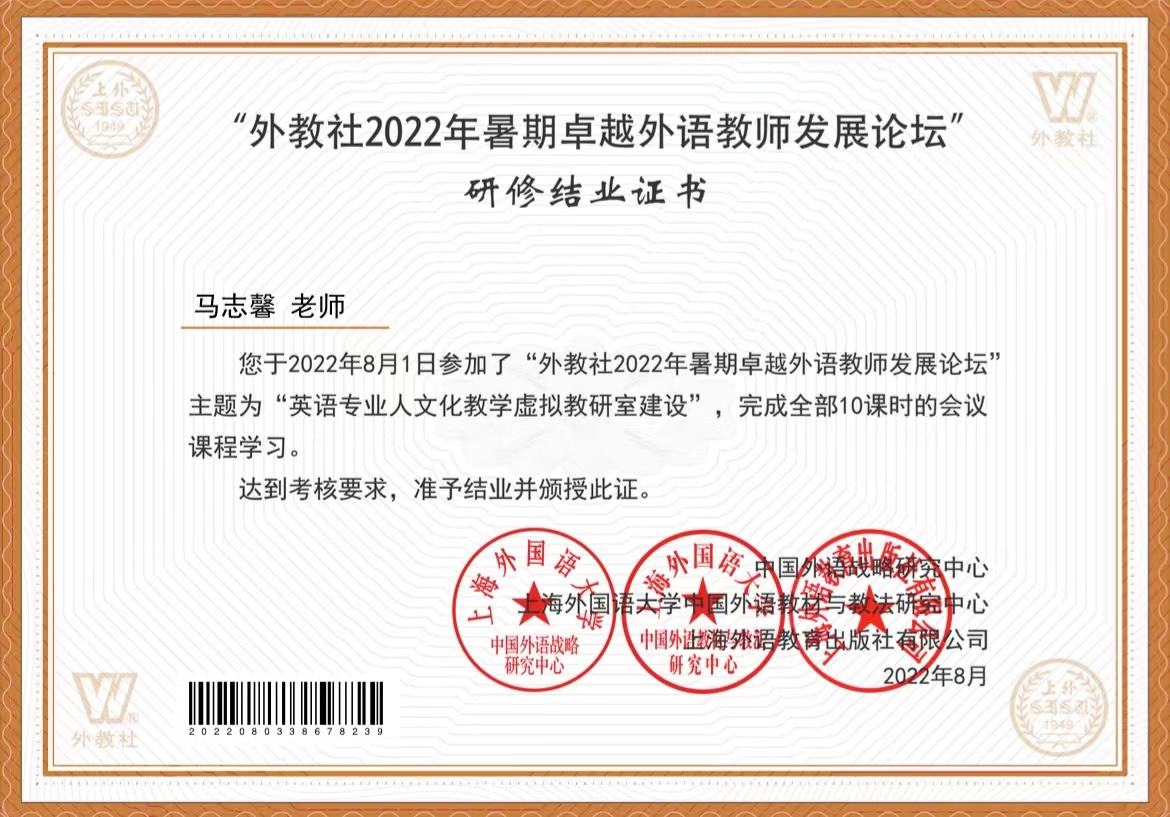 为促进英语专业人文化教育发展,促进共建共享型优质数字资源开发,提升英语专业教学质量,外教社分别于8月1日举办主题为“英语专业人文化教学虚拟教研室建设”,8月2日主题为“基础外语教学评一体化实践与探索”的暑期教师发展论坛研修活动。本次活动采用在线研修方式,通过WExpress公众号和钉钉外教社思飞公司同步直播。基础部选派刘昕子副教授与马志馨副教授参加本次研修班一系列讲座与活动。