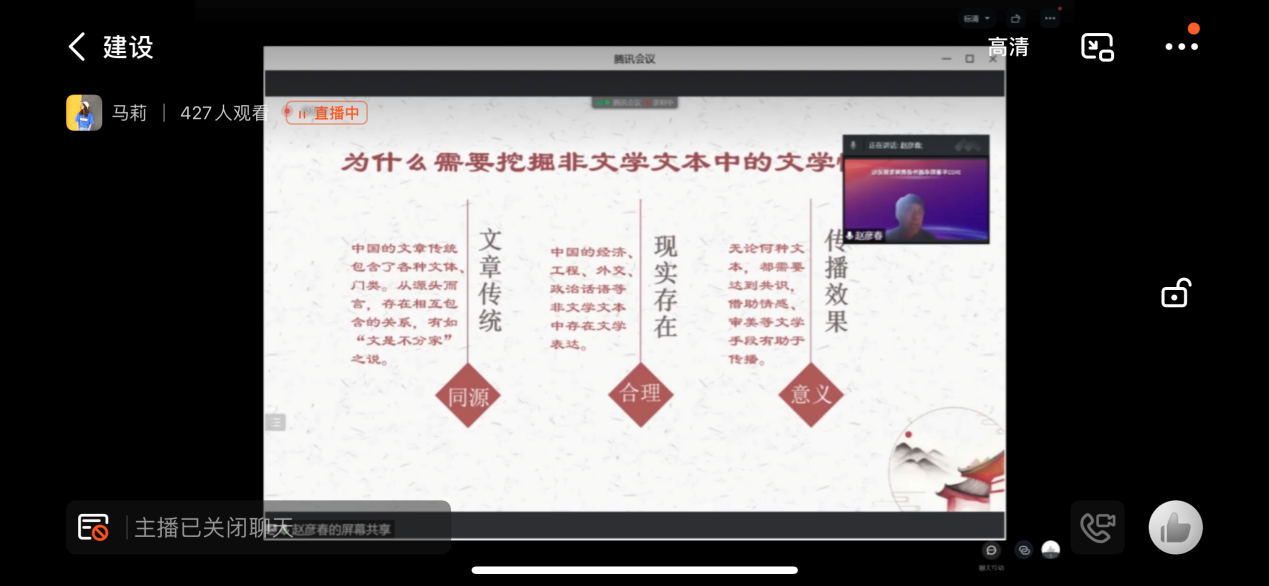 第二场讲座由上海大学翻译研究与出版中心主任,北京语言大学中国文化翻译与传播研究中心主任赵彦春教授,带来题为“善译:非文学中的文学性”的讲座。赵教授从为什么需要挖掘非文学文本中的文学性的角度,举例论证:Literature is across boundaries. Literary translation is omnipresent.