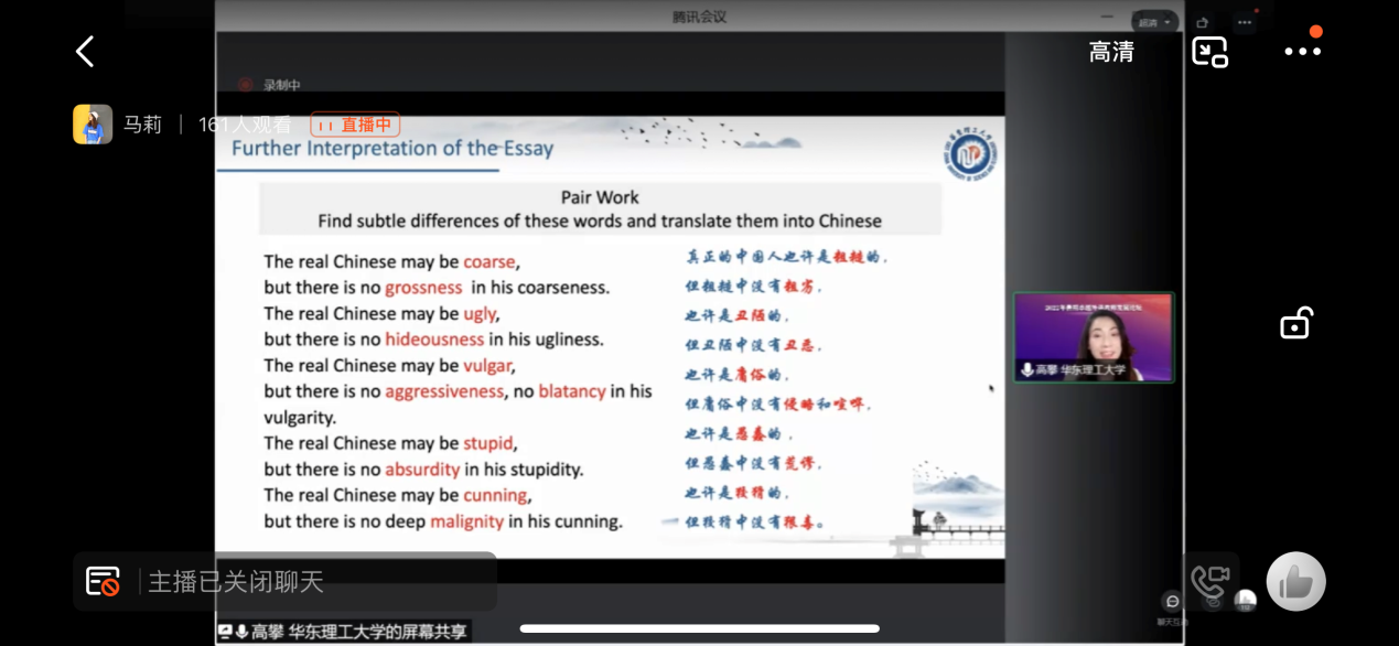 华东理工大学外国语公司英语系副主任,外语演讲辩论中心主任,高攀副教授带来精彩的《中国文化》全英示范课。用流利的英语、丰富的文学知识、热情活泼的授课方式,引导员工对中国文化的深刻理解,以及词汇之间的细微差别。