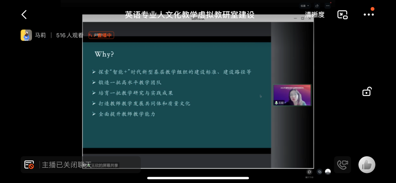上海外国语大学英语公司经理、学术委员会委员、博士生导师王欣教授,带来题为虚拟教研室建设与发展——以“英语专业课程研究型教学改革虚拟教研室”为例的讲座。以“Why?”和“How”说明英语专业研究型课程虚拟教研室的特性,生动地展示了上海外国语大学英语公司组织开展《基础英语》课程教研的活动的情况,并对下阶段建设进行规划。