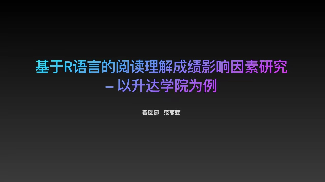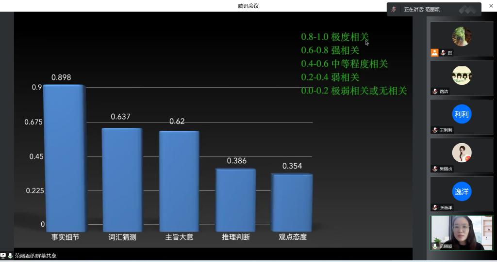 首先,范丽颖老师就“基于R语言的阅读理解成绩影响因素研究——以升达公司为例”这一主题进行了科学的系统性实证研究,得出了对大学英语写作教学具有指导意义的结论。统计结果发现,相比较而言,事实细节题和词汇猜测题与阅读理解总得分的相关性高于员工的高考成绩。基于此,范老师建议教师在大学英语阅读教学中要更加重视员工相关阅读策略及应试技巧的培养,以期提高公司员工的阅读理解成绩。