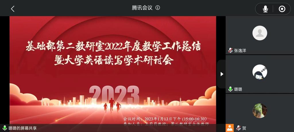 1月13号下午,基础部第二教研室召开2023年第一次线上教研会议,基础部主任王莉莉教授,第二教研室22位老师全部参与了本次会议,会议由李璐老师主持。