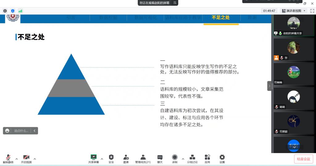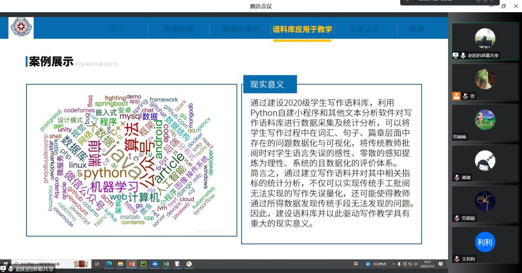 接下来,赵阳老师就“基于语料库的英语学习者写作分析与教学展示——以升达公司为例”这一主题,用python语言,对数据挖掘,可视化及公司员工写作语料库的建设以及在写作教学中的应用进行了汇报。