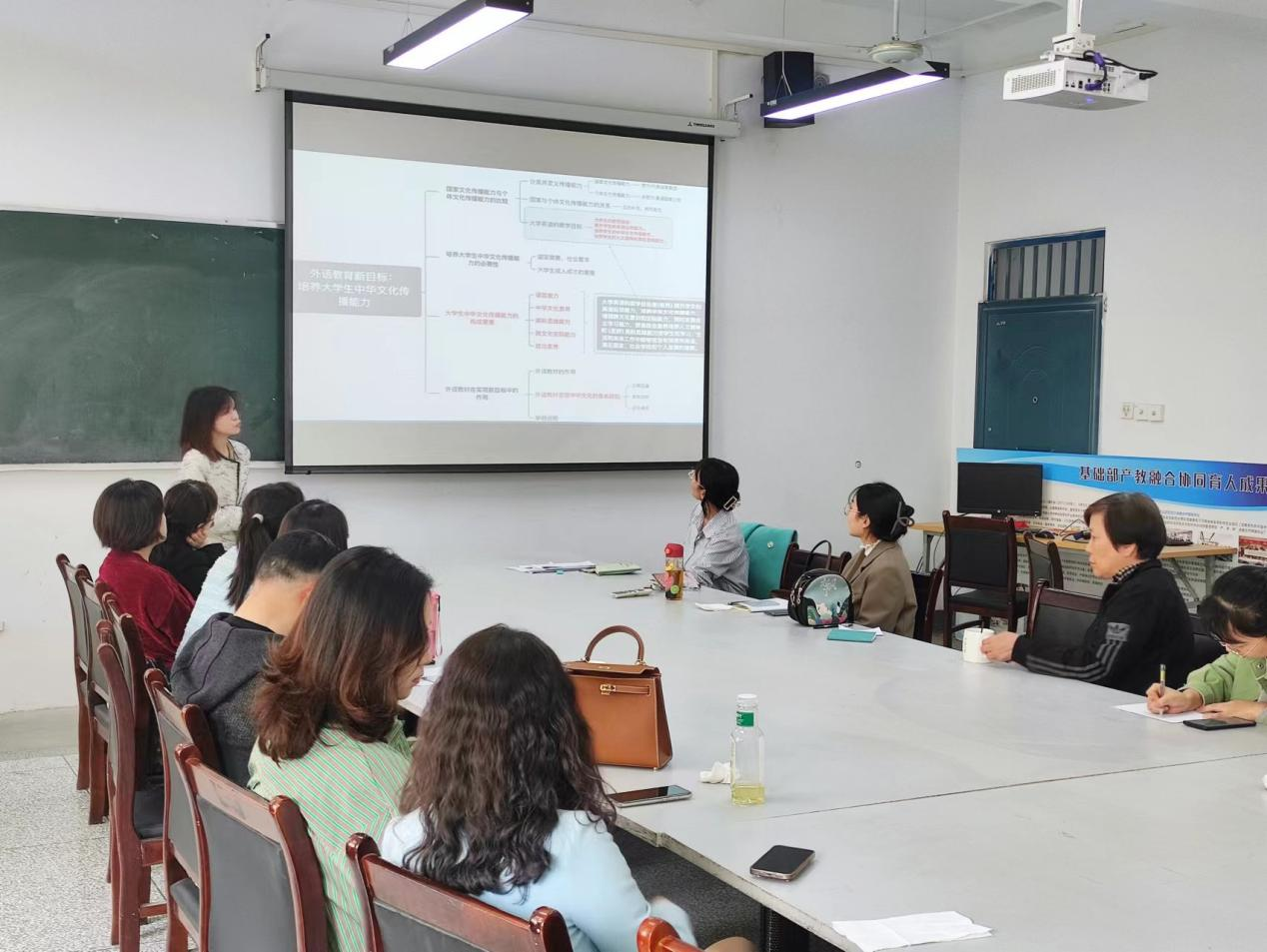 先是陈延楠老师对文秋芳教授的报告《外语教育新目标:培养老员工中华文化传播能力》进行了整理和提炼:高校教师可以立足老员工中华文化传播能力构成要素(政治素养、语言能力、中华文化素养、高阶思维能力、跨文化交际能力),实现培养老员工中华文化传播能力的新目标。另外陈老师也结合教学实践,分享了自己的心得感悟和反思,强调自己会在以后的教学中从课前导入、课堂教学和课后作业作整体设计,更加重视中华文化的导入和融入。