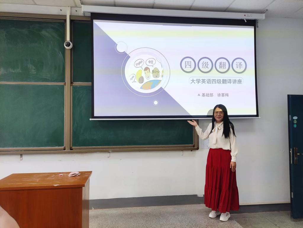 2023年6月6日晚上19:00,徐喜梅副教授利用线上和线下相结合的方式,进行了长达三个小时的四级阅读理解和四级翻译的讲座,该讲座内容充实紧凑,干货满满,真题实例详析精讲,技巧加持。阅读理解讲座包含四部分内容:阅读难题、做题技巧以及讲座总结。首先,徐老师针对同学们在阅读理解部分遇到的难题给出具体分析并强调要打好词汇基础和语法基础,掌握阅读方法,加大阅读训练,进行阅读反思和真题词汇的总结;在做题安排中,徐老师嘱咐同学们要进行做题优先次序的排列,还要关注时间分配的比例,即阅读理解部分建议先做占比20%的仔细阅读用时,因分值较大相应地要给予最好的时间,时间每篇控制在25分钟,其次是信息匹配用时18分钟,然后是翻译用时22分钟,最后是占比最小难度很大的选词填空用时5分钟。
