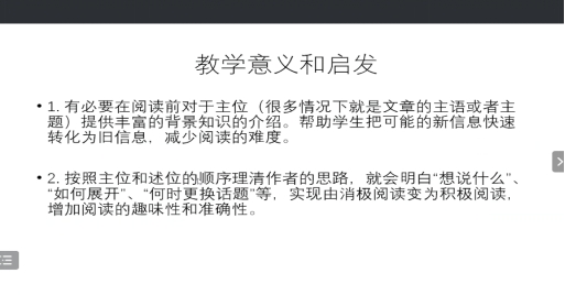 本次活动利用腾讯会议平台进行,主要由孙晓鸣老师为大家做了基于系统功能语法理论的“主位与述位”句法结构拆分理念与课堂教学相融合的教学理念的分享。孙老师所讨论的课程选材是《新视野大学英语第三册》第二单元《Swimming Through Fear》。其授课的主要思路是,首先对全文每一段落中所包含的主位成分进行解析与提取,而多数情况下“主位”成分是我们一些主题句或结尾句亦或是核心信息句子的主语或叙述主题,通过对“主位”的优先提取并对此类成分向员工加以有效的、先在的传达,可以让员工在通读全文之前能够做到对通篇课文的新信息有个重点的了解,就会使员工快速掌握文章作者“想说什么”、“如何展开叙述与论说”、“话题于何时转折变换”等重点信息,如此一来,便可使员工能够尽快地将“位置信息”迅速转化为“已知信息”,以此达到令员工快速融入课文语境,增加员工的学习趣味性与积极性,减少学习的障碍,降低阅读难度。