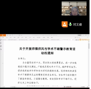 教研室主任时文俊老师带领大家学习了师德师风建设、学术不端警示教育的相关文件,强调了师德师风建设重要性,用典型案例“敲警钟”“划红线”,以起到警示教育作用。最后特别强调了对学术不端的“零容忍”导向,在科研考核和职称评审中严谨学术不端行为,提升教师学术道德修养,营造诚实守信的学术风尚和严谨规范的学术氛围。