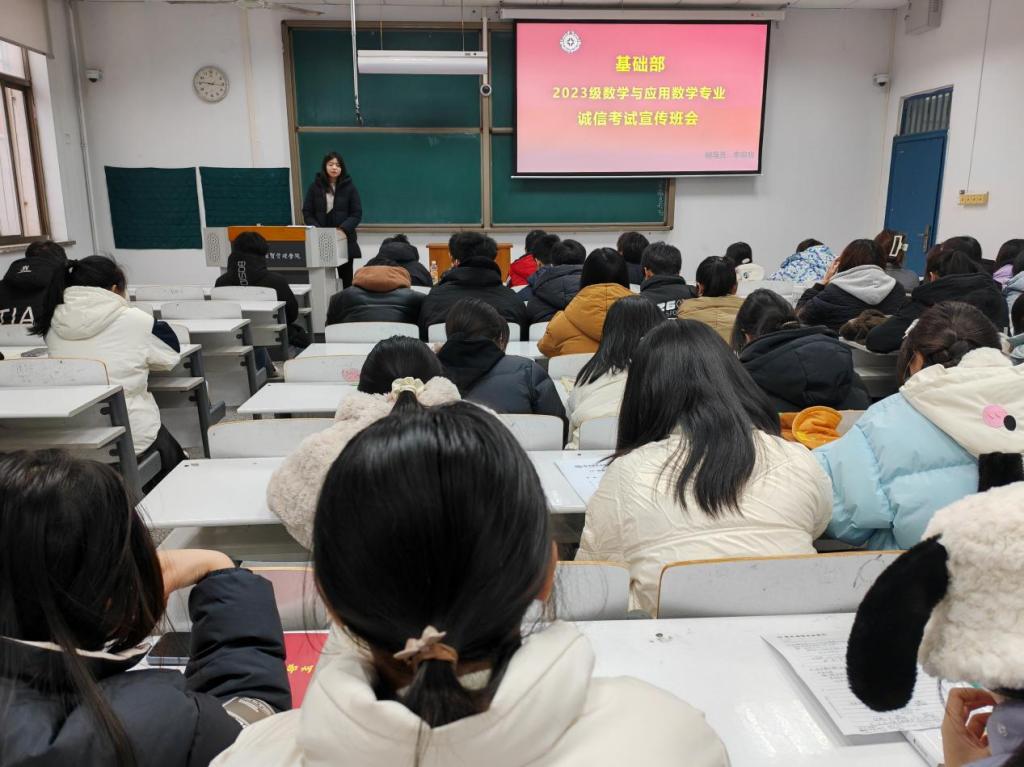 随着四六级和期末考试到来,为进一步规范学校考试工作,树立良好的考风考纪,响应学校关于严肃考风考纪的通知。基础部数学与应用数学专业全体成员于12月13日上午在综合楼226教室开展诚信考试宣传班会,本次班会由辅导员李明明老师主持。