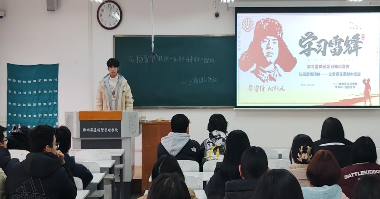 为学习贯彻习近平总书记关于弘扬雷锋精神的一系列重要论述,让学雷锋活动融入日常、化作经常,让雷锋精神在新时代绽放更加璀璨的光芒。基础部数学与应用数学专业全体团员及有志青年于3月6日在综合楼223教室召开传承雷锋精神主题团日活动。